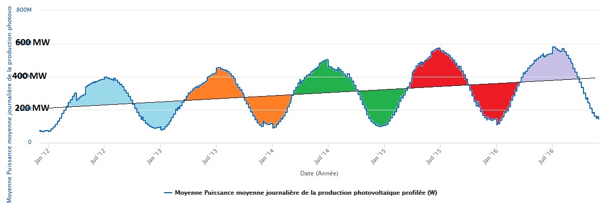 Je voudrais ici aborder, pour oublier un peu l’exemple schématiquement ridicule et peu ensoleillé allemand, parler des générations photovoltaïques françaises dont Enedis publie une courbe représentant la puissance moyenne journalière (l’énergie moyenne quotidienne divisée par 24 heures) du photovoltaïque fournie au réseau (FIG.).