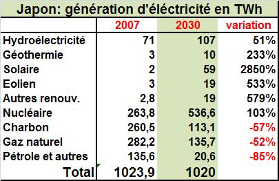 L'équation énergétique japonaise, dans un pays isolé, privé de ressources fossiles et traumatisé par le dernier tsunami et ses conséquences apparaît être d'une grande complexité, balancée entre la crainte nucléaire et la volonté d'indépendance énergétique et de bonne santé économique. Les premiers éléments de réflexion qui paraissent sur ce sujet après le tsunami, semblent montrer une volonté affirmée du Japon de baser son avenir énergétique sur un couplage des énergies renouvelables au nucléaire, seule voie pour lui assurer pour la partie électrique, une large part d'autosuffisance énergétique (70%) dans un contexte géostratégique incertain. L'Institute of Energy Economics (IEEJ) publie les résultats d'une étude qui au-delà des problèmes à court-terme, baserait l'avenir énergétique du Japon à l'horizon 2030 sur la maîtrise des consommations, une forte baisse de l'utilisation des énergies fossiles, un développement du nucléaire et des énergies renouvelables.