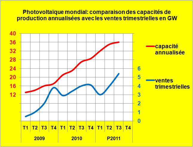 La capacité de production mondiale s'est accrue de près de 70% en 2010 pour atteindre les 30GW, affirme IMS Research. Compte tenu des investissements engagés par les industriels les plus agressifs et par les nouveaux venus avec des technologies innovantes (CIGS) cette croissance de la capacité de production va se poursuivre en 2011 pour dépasser les 36 GW en fin d'année (FIG., courbe rouge, échelle de gauche). Face à cette offre dynamique, il est peu probable que la demande suive, tout simplement parce que ce marché dépend des subventions des États ou des tarifs préférentiels dissuasifs payés par les consommateurs. Or le climat en Europe, marché principal du photovoltaïque, est aux économies. Les États, les uns après les autres, découvrent que la facture cumulée des fournitures d'électricité photovoltaïque devient insupportable. La dernière venue est la République Tchèque qui a décidé de taxer les productions des grandes installations (>30kW) pour une période de trois ans (2011-2013).