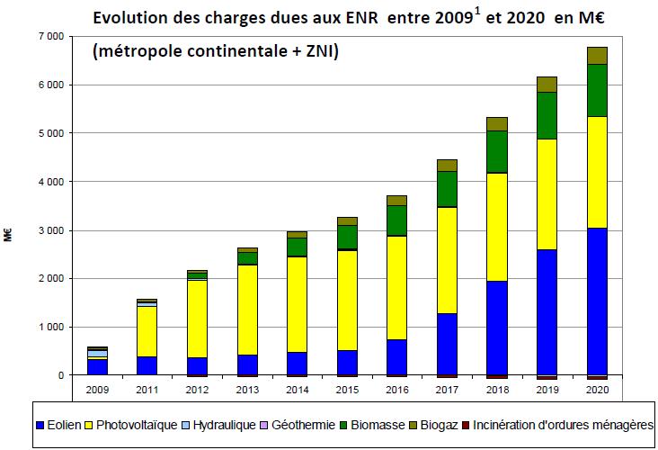 En 2011 la production des ENR "soutenues" devrait atteindre 26 TWh soit 4,5% de l'énergie électrique totale, ce qui représentera une charge de 1,6 milliards d'euros pour le consommateur.