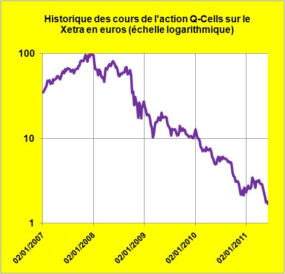 Largement sponsorisée par les avantageuses subventions tarifaires allemandes et transitoirement espagnoles, l'industrie allemande du photovoltaïque a connu son âge d'or et maintenu pendant longtemps un prix au watt des modules qui ne pouvait qu'inciter la convoitise des concurrents asiatiques. Cette distorsion artificielle des prix de marché leur ouvrait la possibilité de vendre en euros forts leurs modules, à base de silicium chinois peu onéreux, produits à vils prix. Absurdité idéologique d'un boom à la charge du consommateur allemand d'électricité, d'une industrie solaire dans un pays plutôt défavorisé par l'ensoleillement. Pour suivre la chronologie de cette aventure il suffit de regarder les cours de l'action d'un important industriel de cette industrie: Q-Cells (FIG.).