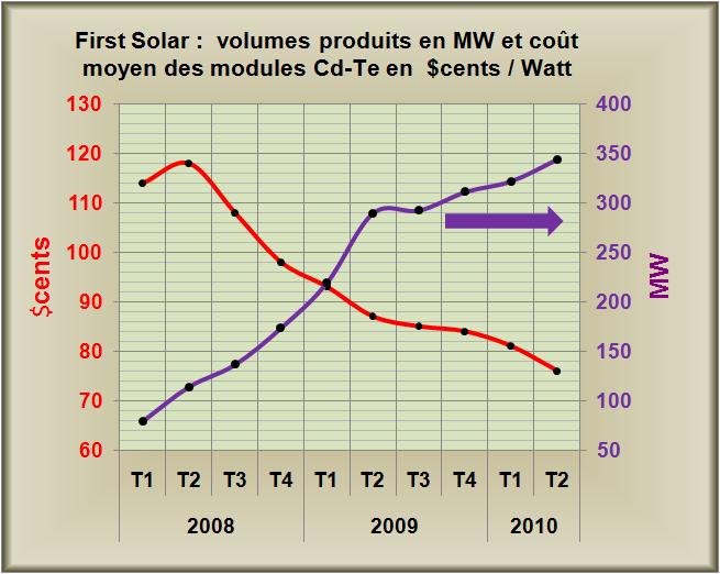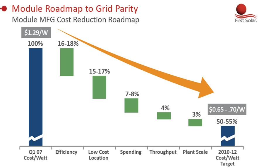 Le premier poste qui est celui du prix d'achat des modules est pour l'instant déterminant. La technologie la plus compétitive du moment qui est celle de l'américain First Solar avec ses modules au CdTe en couches minces. Il annonce des prix de revient des modules de 0,77$/Watt pour un rendement de conversion de l'énergie lumineuse de 11,3%. Compte tenu de la puissance réduite (80 Watts) et du faible rendement des modules, leur pose et leur raccordement multiplie le prix pratiquement par trois pour atteindre tout compris 1,6 euro/Watt en Europe et donc autour des 2.2$/Watt aux Etats-Unis. Il prévoit pour 2014 un prix de revient des modules au tour des 0,52 à 0,63 dollars par Watt. Mais il est clair que si les coûts annexes ramenés au Watt ne sont pas réduits, l'objectif de 1 euro ou 1,3 dollar par Watt ne sera jamais atteint.
