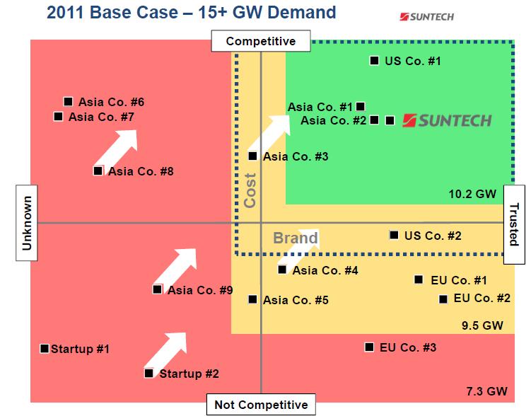 D'autres fabricants de modules solaires jouent une approche haut de gamme, a l'aide de cellules à base de silicium monocristallin. C'est le cas de l'américain SunPower par exemple qui présente un module de 318 Watts avec un rendement de conversion de 19,5% stabilisé en module (LIRE), réalisé par assemblage de 96 cellules présentant des rendements de conversion supérieurs à 23%. C'est également l'approche des grands constructeurs asiatiques qui ont bien compris que la taille et la puissance d'un module était un paramètre important de compétitivité. Mais compte tenu de la complexité d'un module assemblé à partir de nombreuses cellules de silicium (typiquement entre 60 et 96), le prix de revient au watt est supérieur à celui des modules en couches minces. Suntech annonce un prix de module de 1,4 $/watt qu'il voit descendre vers les 1,1 dollar grâce à l'intégration de la production de wafers et vers 0,85 $/watt à l'horizon fin 2013 en ajoutant toutes les actions de réduction de coûts (FIG.).