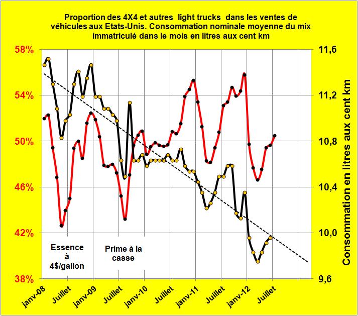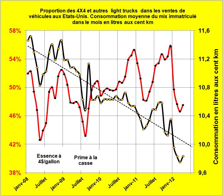 On a vu récemment la consommation moyenne des voitures américaines neuves passer au-dessous des 10 litres aux cent km. La tendance de cette décroissance est de l'ordre de 2% par an depuis 5 ans, ce qui conduit pour un parc qui doit se renouveler tous les 12 ans environ à une réduction des consommations annuelles voisine de 0,2%. Cette vertueuse évolution devrait se poursuivre avec l'accroissement des prix des carburants à la pompe, avec une diesélisation partielle des ventes de voitures allemandes (VW) et avec la montée en puissance des véhicules hybrides japonais et américains (Ford est licencié de Toyota). Dans un très bref délai de temps, toutes les voitures haut-de-gamme se devront d'être hybrides.