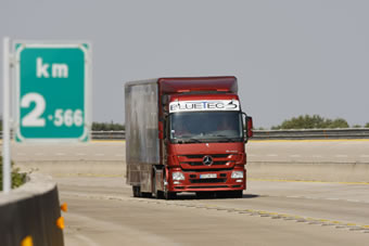Mercedes fait de la publicité pour ses camions sur le thème des économies de consommation de carburant. Compte tenu des prix du gazole à la pompe et des problèmes financiers de certains transporteurs routiers, cette approche n’est pas dénuée de pertinence. Mercedes a fait rouler un de ses camions Actros de 40 tonnes, sur le circuit de Nardo dans le Sud italien, durant 7 jours à 80 km/h de moyenne en tractant une charge de 25 tonnes. Ce camion, dans ces conditions idéales, a parcouru près de 13000 km en consommant moins de 20 litres aux cent kilomètres (19,44 litres/100 km). Bien sûr il était équipé de tous les raffinements aérodynamiques, de toutes les aides à la conduite et surtout, sur un circuit, il a roulé à vitesse constante et il n’a rencontré aucun embouteillage. Dans des conditions courantes il aurait consommé au moins 30 litres/ 100 km.