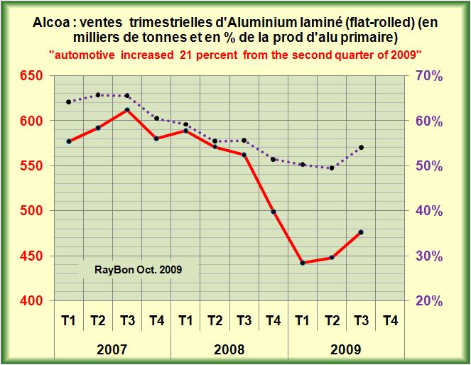 La publication précoce par Alcoa de ses résultats trimestriels est toujours instructive pour la perception des tendances de l'économie mondiale. En particulier, ses ventes d'aluminium et plus précisément de ses produits laminés à la base des industries aéronautiques et automobiles constituent des indicateurs pertinents. Alcoa affirme que ses productions d'aluminium de première fusion durant le troisième trimestre, à 881 milliers de tonnes, ont régressé de 25 mille tonnes par rapport à celles du trimestre précédent. Quand à ses ventes à 698 mT, elles ont régressé de 80 mille tonnes. On ne peut pas dire à partir de ces chiffres que la reprise soit franchement en marche. Cependant un examen plus précis des ventes de produits laminés à 476 mille tonnes marque une reprise des ventes de 28 mille tonnes par rapport à celles du trimestre précédent (FIG.). Le Groupe affirme que les commandes de l'industrie aéronautique sont toujours aussi déprimées, mais que les ventes de ces produits semi-ouvrés progressent dans tous les autres secteurs. En particulier, les ventes à l'industrie automobile ont marqué un progrès de 21% sur le trimestre.