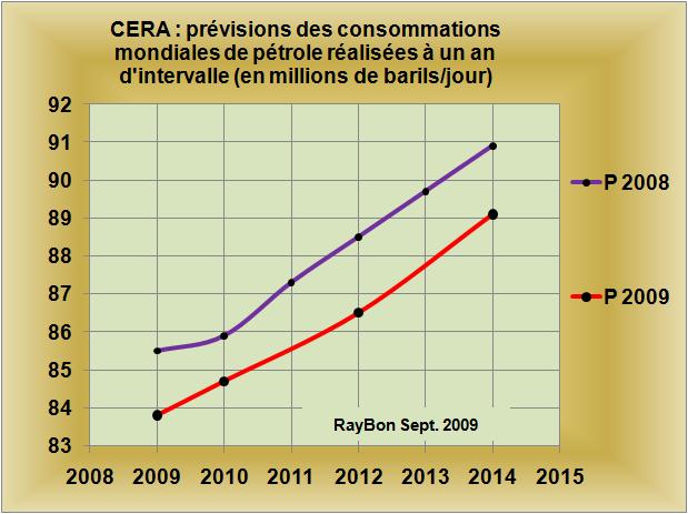 Le CERA (Cambridge Energy Research Associates) célèbre bureau d'études sur l'énergie du Massachussetts, vient de publier une actualisation de ses projections de consommations et de ressources de pétrole mondiales pour les décennies à venir. A partir d'une base de données qui recense 24000 champs pétroliers ou gaziers actifs et d'un éventail de 450 champs actuellement en développement (FUD), cet institut de recherches conclut que les capacités de productions estimées à ce jour à 92 millions de barils/jour pour une demande de 84 millions de barils/jour, pourront suivre une éventuelle croissance de la demande jusqu'à 115 millions de barils/jour en 2030 (FIG.I).