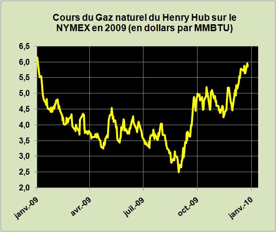 Durant l'année les cours du gaz aux Etats-Unis se sont totalement effondrés jusqu'à 2.5 $/MMBTU au début du mois de Septembre. Ils sont remontés vers les 6$ depuis ce qui est équivalent, à quantité d'énergie comparable, à 35 $ le baril de pétrole. L'abondance de gaz naturel dans le monde, ses cours raisonnables, sa diffusion par gazoduc ou sous forme de GNL et son efficacité dans la génération d'électricité à l'aide des centrales à cycle combiné en font le champion potentiel des diverses énergies primaires accessibles et raisonnablement polluantes (deux fois moins que le charbon). Les Etats-Unis ont ravi la place de premier producteur de Gaz Naturel à la Russie. La politique de prix rigides indexés sur ceux du pétrole et les contraintes des accords de "take or pay" rendent le commerce de Gazprom avec ses clients européens assez difficile.