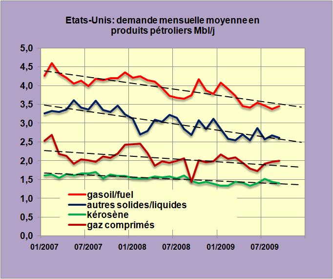 En particulier dans ces prévisions aucune contrainte climatique n'est évoquée. A une croissance de l'économie doit correspondre inéluctablement une croissance de la consommation d'énergie fossile. Pour apporter à ces prévisions quelques nuances je pense qu'il est au moins nécessaire de les corriger de la contribution des biocarburants à la demande mondiale. En 2009 les productions mondiales de biocarburants peuvent être estimées à 1,56 millions de barils/jour dont 0,3 millions de biodiesel. Pour 2010 il est possible de prévoir une forte croissance des volumes de biodiesel à 0,36 millions de barils/jour, une faible production d'éthanol au Brésil, en raison d'une faible récolte de cane à sucre (0,45 mbl/j), mais de fortes croissances de production d'éthanol aux Etats-Unis (>0,79 mbl/j) avec l'adoption du carburant E15 et dans le reste du monde avec l'arrivée des pays en voie de développement sur ce marché agricole peu complexe. L'ensemble de ces données permet de tabler, de façon prudente, sur des volumes de biocarburants de 1,75 mbl/j en 2010 et de 2 mbl/j en 2011.