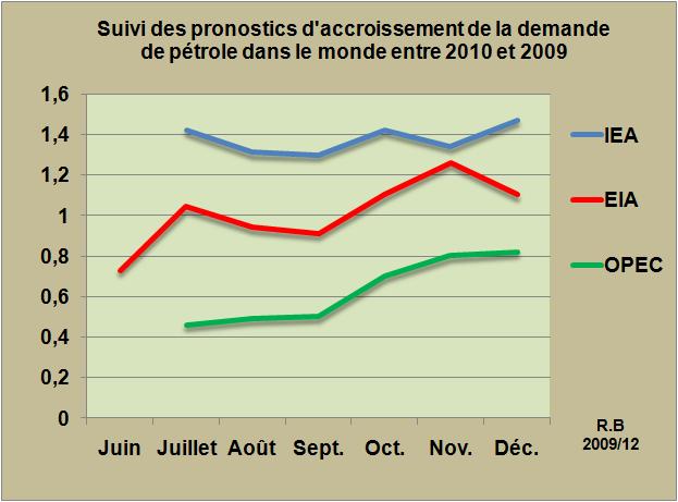 Trois organismes dans le monde publient chaque mois leur meilleure vision de la variation attendue des consommations de pétrole pour l'année suivante. Généralement c'est l'agence Internationale de l'Energie qui représente les intérêts de l'OCDE qui est la plus "bullish" et qui a dans le passé publié des prévisions stupides qui ont participé à la création de la bulle de 2008. L'OPEP réalise ses propres pronostics à partir d'une connaissance de terrain du marché et ses prévisions sont souvent en retrait par rapport à celles des autres Agences. Enfin, le troisième larron qui est l'Energy Information Administration américaine, publie des prévisions qui sont généralement entre celles des deux premières. Un examen des prévisions pour 2010 réalisées mois après mois, montre que cette classification est toujours d'actualité (FIG.). Au mois de Décembre l'IEA a remonté ses prévisions à 1,47 mbl/j (?), l'EIA les a baissées pour tenir compte de la faible demande dans les pays OCDE à 1,1 mbl/j et l'OPEP a conservé les siennes stables à 0,82 mbl/j.