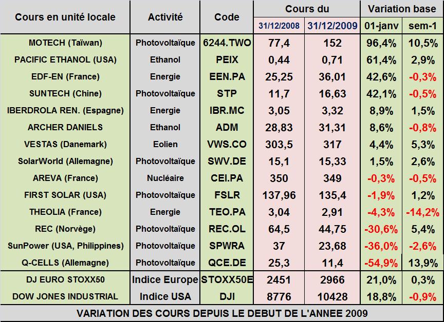 La sortie de la crise économique et des errements tarifaires espagnols dans le photovoltaïque ont causé de profonds ravages dans les industries photovoltaïques européennes. L'effondrement des prix du Silicium chinois et de celui des wafers a porté un rude coup au norvégien REC un des leaders mondiaux dans le domaine. Malgré un rattrapage de window-dressing de fin d'année son cours a chuté de 30% en 2009, il avait déjà plongé de 77% en 2008. Produire du Silicium et ses dérivés en Europe ou aux Etats-Unis est devenu une activité peu lucrative. Comme quoi, on peut être un acteur majeur du greenbusiness et perdre sa culotte. L'autre exemple de plongeon boursier est celui de Q-Cells le leader allemand du photovoltaïque. Lui aussi, malgré le coup de pouce de fin d'année qui a fait opportunément remonter le cours au dessus des 10 euros, finit l'année 2009 avec une dégringolade de 55%, il en avait déjà perdu 75% en 2008. Il ne fallait pas placer ses économies dans l'industrie du photovoltaïque européen en 2009. Par contre les milieux boursiers ont bien compris que l'avenir de cette industrie se trouvait maintenant en Asie. Les cours de certains acteurs chinois cotés à New York ont été multipliés par 5,8 (Trina Solar), par 4,5 (Canadian), par 2,6 (Yingli). Le plus gros des acteurs asiatiques, Suntech, n'a gagné que 42% et son homologue taïwanais Motech a presque doublé de valeur (TAB.).
