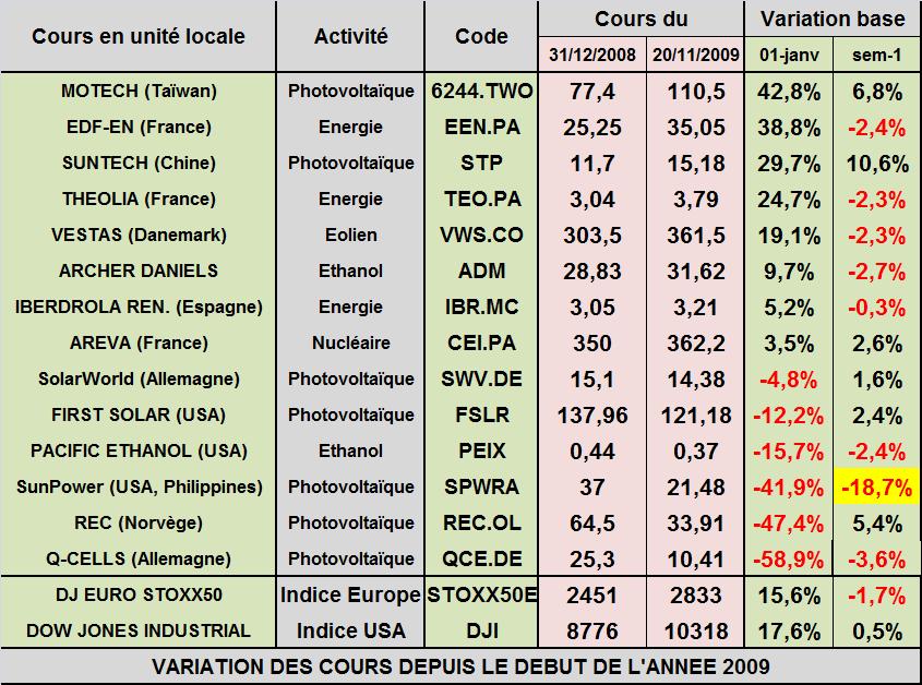 TAB. : variations des cours en 2009 de quelques industries représentatives du greenbusiness