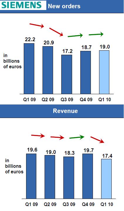 Siemens, prototype de la grande industrie conquérante allemande rencontre certaines difficultés à collecter de nouvelles commandes. Au cours des trois derniers mois qui constituent pour Siemens le premier trimestre de l'exercice décalé 2010, ses entrées de commandes à 19 milliards d'euros ont affiché un recul global de 15% par rapport à celles d'il y a un an (FIG.). Sa division "Industrie" affiche un recul des commandes de 16% avec des secteurs fortement impactés comme sa partie "Industry Solutions" qui recule de 36%, à côté d'un secteur éclairage "Osram" qui progresse de 3%. La division "Energie" avec des commandes en recul de 19% affiche elle aussi des résultats très contrastés avec un recul de 49% des commandes d'équipements de types "Fossil Power Generation" et une superbe avancée de la partie énergies renouvelables qui voit ses entrées de commandes être multipliées par 2,4. Commandes de près de 1,6 milliards d'euros qui correspondent majoritairement à l'activité éoliennes offshores de Siemens dont nous avons déjà parlé ici.