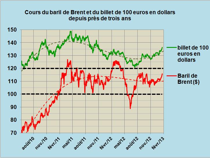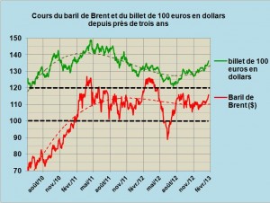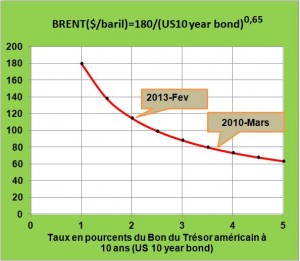Entre Mars 2010 où le Brent cotait moins de 80 dollars le baril et Février 2013 ou les cours frisent les 120 dollars les taux du Bon du Trésor américain à 10 ans sont passés de plus de 3,5% à 2% aujourd’hui en suivant en moyenne la tendance de la courbe de la FIG.II.