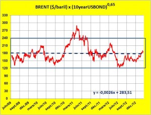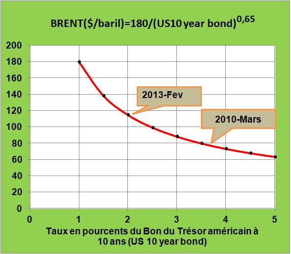 BRENT ($/baril) = 180 / (US 10 year bond)0.65 (Puissance 0.65)