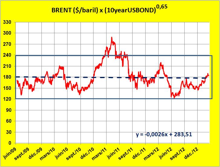 La droite de corrélation (FIG., ligne en tirets) du produit des cours du baril de BRENT en dollars par le taux du Bon du Trésor américain à 10 ans élevé à la puissance 0,65 en fonction du temps sur plus de 3 ans est sensiblement horizontale.
