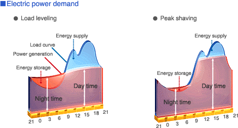 Le message important qu'il faut retenir de ce projet est le rôle fondamental de "load leveling" (FIG.) que vont jouer les batteries Sodium-Soufre au sein du système complexe. C'est le seul système électrochimique à ce jour qui peut être envisagé sérieusement pour du stockage de masse d'électricité en raison de la grande disponibilité des matériaux utilisés (sulfure de sodium, carbone, alumine béta comme séparateur et aluminium comme boîtier). La France (ou l'Europe) doit impérativement lancer un ou plusieurs projets sur ce type de stockage. Pour l'instant la seule source industrielle pour ce type de batteries est le japonais NGK Insulators (LIRE) qui assure avoir reçu commande de la part d'EDF EN. ("NAS batteries: Overseas market is active due to orders received from Abudhabi and EDF-EN. Demand for stabilization of the power distribution system is expected to increase due to the spreading use of renewal energy." déclare NGK dans son dernier rapport trimestriel).