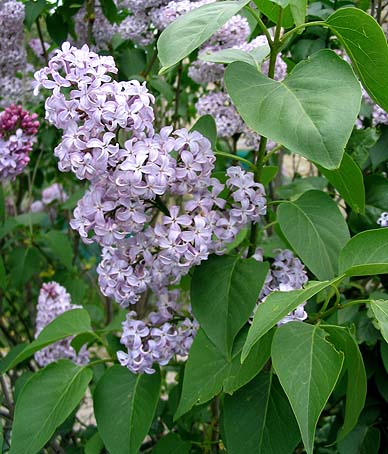 Le lilas commun, (syringa vulgaris) est un arbuste à feuillage caduc qui porte en mai des fleurs en forme de panicules pyramidales érigées, très odorantes.