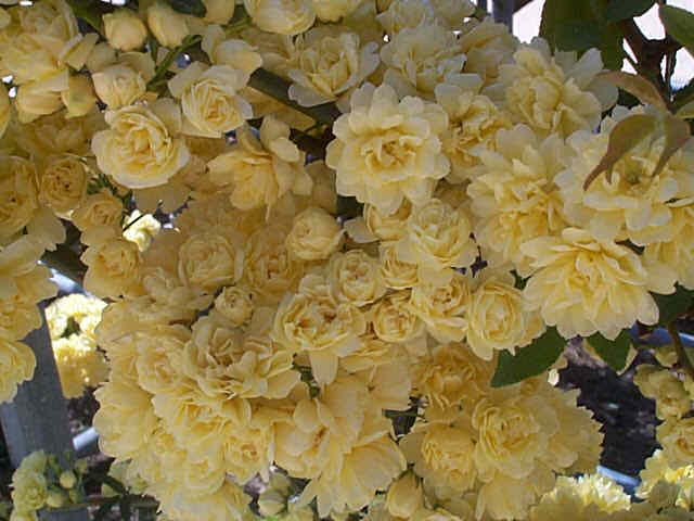Le rosier de Banks (rosa banksiae) d’origine chinoise a pour originalité d’être dépourvu d’épines et d’avoir un feuillage coriace, persistant toute l’année; sans souci, et sans entretien, c’est un rosier sarmenteux très vigoureux, qui grimpe à l’assaut des plus grands arbres, dans un fouillis inextricable de lianes ployant sous une avalanche de petites roses.