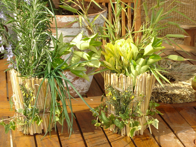 Étalez votre paillon, et coupez sur toute la longueur 2 bandes de 15cm de haut, en gardant bien dans chaque bande la ficelle qui maintient la paille. D’une main, enroulez la bande autour du pot , pendant qu’avec l’autre vous enfilez l’élastique par le bas pour le maintenir. Ne faîtes pas chevaucher les extrémités, mais répartissez bien les pailles tout autour du pot. Faîtes, avec les genets, des petits fagots que vous glisserez sous l’élastique entre les pailles en 3 endroits. Liez le tout, au niveau de l’élastique, avec la tige de lierre que vous nouerez sur le devant. Après avoir réalisé de la même façon le second vase, retaillez le haut des paillons aux ciseaux, afin qu’ils soient bien droits, et de même hauteur.