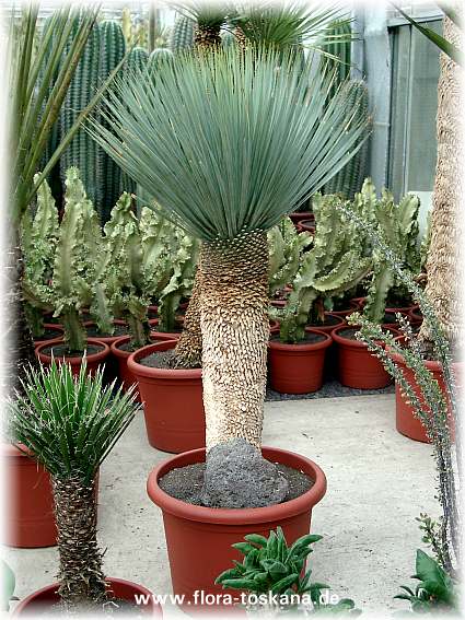 De son stipe, à l’allure de moon-boot, lorsqu’il est recouvert de sa jupe de feuilles sèches, emerge une belle couronne de feuilles longues et fines, recouvertes d’une cire qui lui donne sa couleur bleutée. La plante peut même vous gratifier au printemps, d’une longue inflorescence blanche de 1,50m.