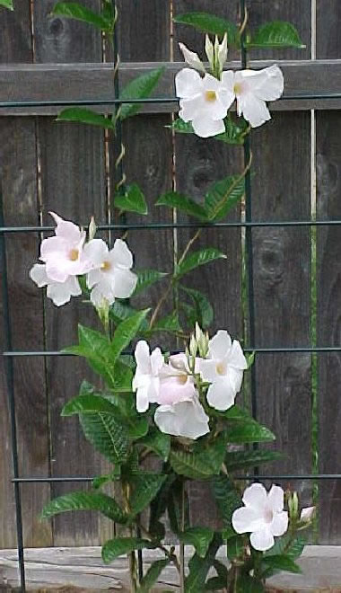 Les longues tiges du mandevilla s’enroulent autour des supports qu’elles rencontrent; leurs fleurs roses, blanches, plus rarement jaunes, en forme de trompette, de toute beauté, regroupées en grappes de 5 ou 6 sont mises en valeur par un feuillage charnu et coriace d’un beau vert sombre.
