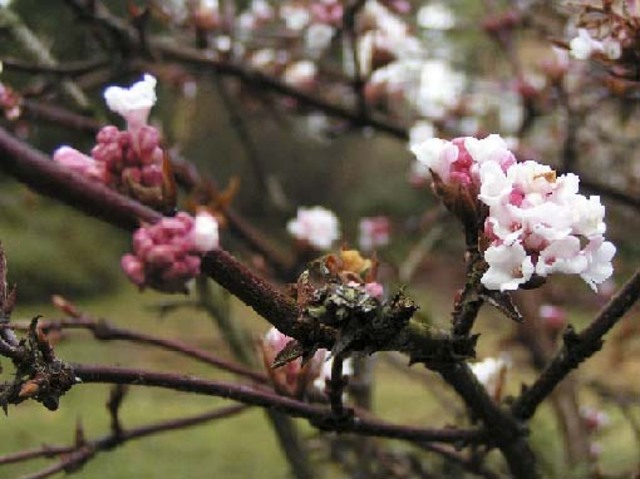 La premiere à s’épanouir au milieu de l’automne et jusqu’en février: viburnum x bodnantense » « Charles Lormont » à fleurs roses. Vient ensuite au mois de décembre janvier la floraison parfumée, comme son nom l’indique, du v. fragans.