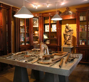 Le cabinet de curiosités : il rassemble des planches de botanique, des outils de jardin et des ouvrages spécialisés et des livres anciens, des vases, des objets décoratifs en terre cuite, des collections d’insectes et d’oiseaux naturalisés ; sans oublier des échantillons de produits exceptionnels qui pourront être réalisés sur commande comme des modèles de tente de jardin avec le nouveau tissu imperméable « Porquerolles » édité par Pierre Frey.