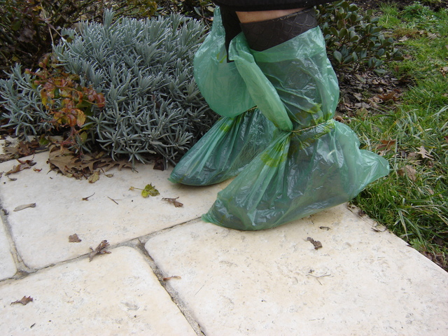 Jusqu’à ce que j’ai cette idée lumineuse, (je me demande pourquoi elle m’est venue si tard) à chacune de mes sorties au jardin, de glisser simplement mes chaussures dans 2 sacs plastiques retenus par un élastique. C’est rapide, pratique, on ne salit plus la maison et surtout plus besoin de se déchausser.
