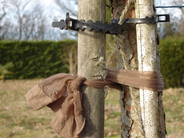 Le tuteur doit être placé de préférence du côté du vent dominant, pour protéger l’arbre et mieux le soutenir. Il est préférable de le planter profondément dans la terre ferme, juste à côté du trou de plantation; pour les grands arbres, 3 attaches, régulièrement espacées, seront necessaires pour relier le tronc et son tuteur; on trouve dans les jardineries des attaches en plastique pratiques et très solides. Le système D consiste à utiliser de vieux collants en maille et de relier le tronc et le tuteur en dessinant un 8.
