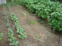 Depuis quelques années au lieu de semer quatre à six rangs de pieds de haricots, je n’en sème plus que deux, et je renouvelle régulièrement mes semis pour avoir des haricots jusqu’à l’automne. Comme vous pouvez le voir sur ma photo, les plants, à droite, sont en fleurs et j’aurais sans doute des haricots cette fin de semaine. A gauche, vous pouvez constater que leurs remplaçants sont déjà bien germés.
