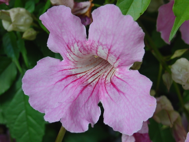 Sous ce nom peu connu de podranea ricasoliana, se cache une superbe grimpante très luxuriante, la bignone rose. L’avoir au jardin est un vrai bonheur dont on ne se lasse pas tellement la floraison est extraordinaire! Ses fleurs en trompettes d’un beau rose soutenu veiné de rouge forment de belles grappes qui attirent le regard. Cette plante a une croissance extrèmement rapide une fois qu’elle est bien installée mais a besoin d’être palissée car elle ne dispose pas de moyens propres à s’accrocher par elle- même.