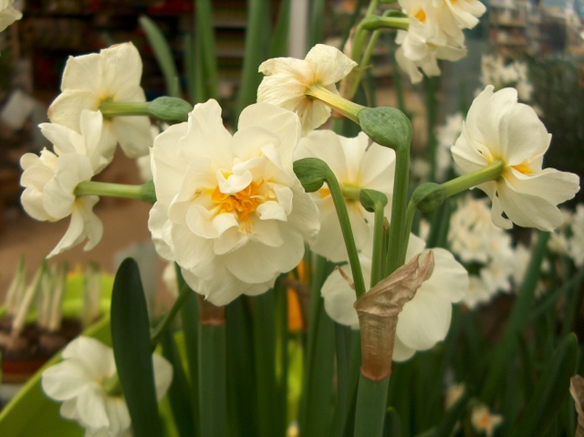 Narcisses_doubles Lorsqu’ils fleurissent au jardin et forment des taches blanches et jaunes, le jardinier est tout ragaillardi car cela signifie que les beaux jours ne sont pas loin. J’apprécie ces signes qui sont les prémices du printemps et ces bulbeuses qui poussent un peu partout sont un enchantement.