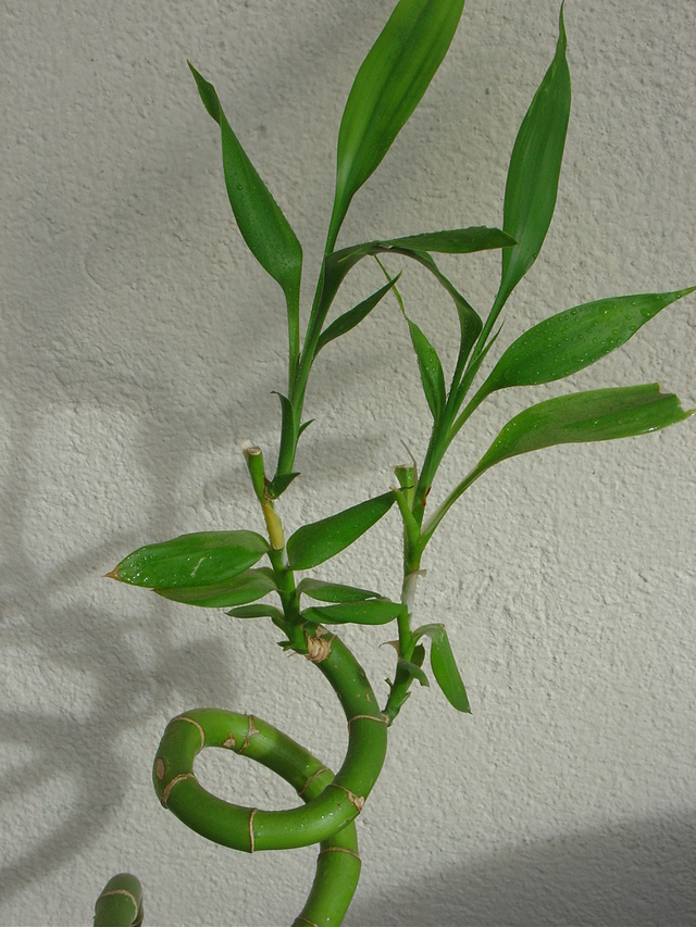 Les racines sont apparues et des feuilles sont sorties en haut de la tige, sur la dernière boucle de la spirale. Je ne dérange pas mon lucky bamboo, je me contente de rajouter de l’eau mais pas celle du robinet qui chez moi est chlorée et calcaire, l’eau de pluie est bien meilleure pour mon protégé.