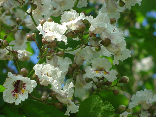 Bien qu’il soit souvent confondu avec le paulownia, on le reconnait facilement. Son tronc est surmonté d’un épais feuillage qui en ce moment, s’accompagne d’une belle floraison. Les fleurs du catalpa sont en forme de cloche, disposées en grappes et d’une couleur blanche réhaussée par les stries pourpres et jaunes de leur gorge. Des gousses pendantes de bonne taille succèdent à la floraison, elles renferment de grosses graines noires que l’on peut récupérer pour faire des semis.
