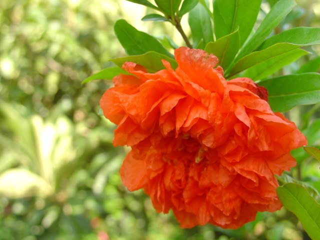 Le grenadier à fleurs a un joli port ramifié, il est d’une hauteur plutôt raisonnable, (entre 3 à 6 m) et son feuillage devient jaune d’or à l’automne ce qui en fait un arbre décoratif bien aprés l’été. Mais ce qui le rend particulièrement interessant, ce sont ses fleurs d’un rouge lumineux. Les gros boutons en s’ouvrant libèrent un flot de pétales tout froissés et trés serrés les uns contre les autres comme des pompons.