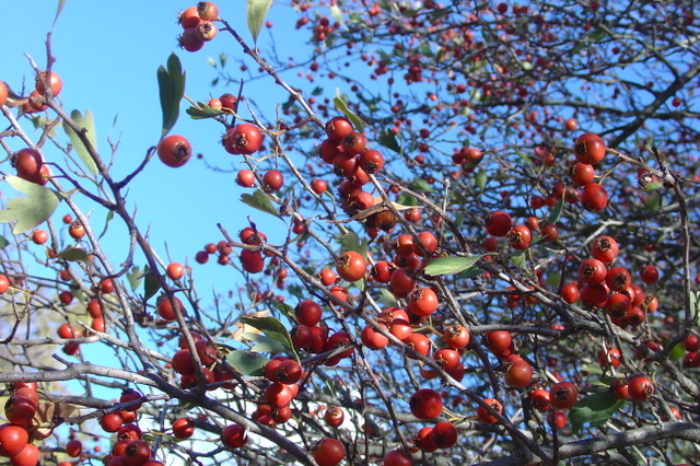Au printemps l’azerolier a une floraison blanche très odorante, cet arbre prend alors un aspect neigeux. Les petits fruits ronds apparaissent ensuite, ce sont de petites billes vertes qui virent au rouge vif une fois qu’elles sont mûres. En ce moment les branches sont chargées d’azeroles et on ne voit qu’elles car l’arbre du fait de la sècheresse qui sévit, s’est délesté de ses feuilles.