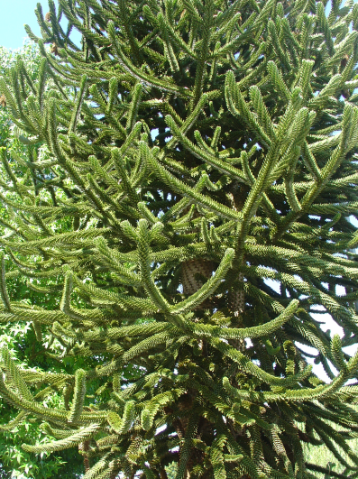 L’araucaria se démarque vraiment des autres conifères. Ses branches étagées portent un feuillage vert brillant en écaille qui est trés coriace et piquant. Impossible de grimper aux branches sans se blesser ,c’est pour cela que cet arbre est surnommé : »désespoir des singes ».