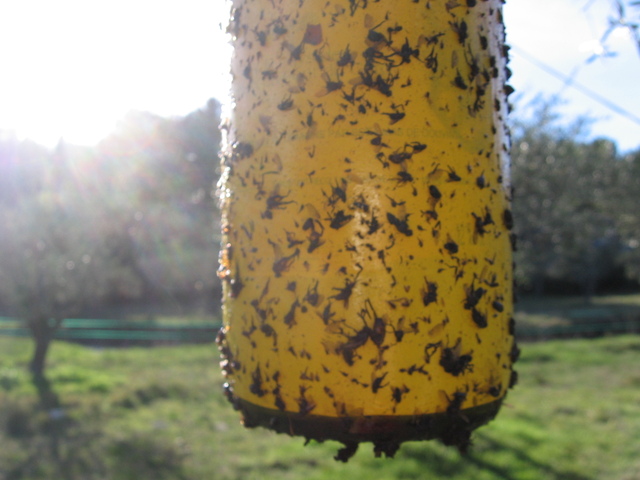 Certaines années, la mouche de l’olivier sévit tellement que les récoltes sont bien compromises. Un moyen efficace de les combattre est de les piéger avant la ponte et c’est là que les pièges telles ces bouteilles enduites de glue s’avèrent d’une grande utilité.