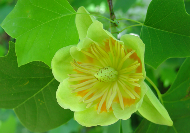 Bien cachées au milieu du feuillage, les fleurs du tulipier de Virginie se fondent dans le vert des feuilles du fait de leurs pétales jaunes-vert. C’est le cercle orange situé au centre de la fleur qui m’a intriguée et c’est comme cela que j’ai découvert cette beauté timide abritée des regards.