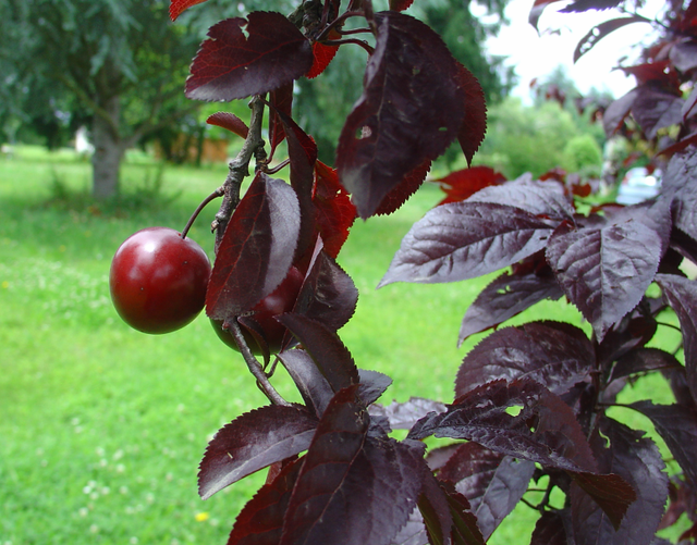 Au milieu d’une haie bien verte, le feuillage pourpre de ce prunier d’ornement se détache et met une touche de couleur. Pourpre : une couleur que l’on retrouve sur certaines variétés d’arbres ou d’arbustes et qui change de la monotonie verte des autres feuillages.