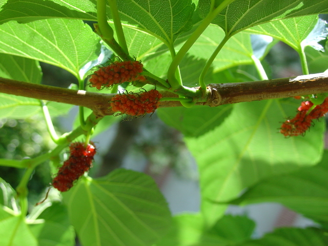 Rien de tel avec les fruits du mûrier platane, ils sont regroupés sur les branches de l’arbre et ne sont pas difficiles à attraper.