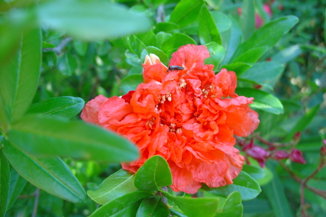 Il m’en aura fallu de la patience avec ce grenadier! Il était installé en plein soleil mais aussi en plein mistral, vent qu’il n’aime pas beaucoup. Pendant quelques années il est resté tout petit, il vivotait, ne grandissait pas mais n’avait pas l’air malade non plus, finalement j’ai décidé de le déménager et voilà qui l’a dopé!