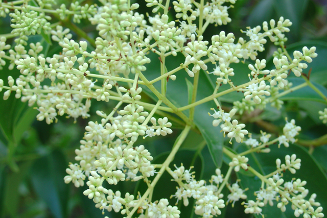 Sous le troène du Japon il y a une multitude de petits pétales blancs un peu jaunis, ce sont ceux des inflorescences qui sont tombées. Mais il reste encore sur l’arbre de belles grappes de fleurs et c’est tant mieux car elles émettent un parfum que j’aime bien même si par moment il devient entêtant.