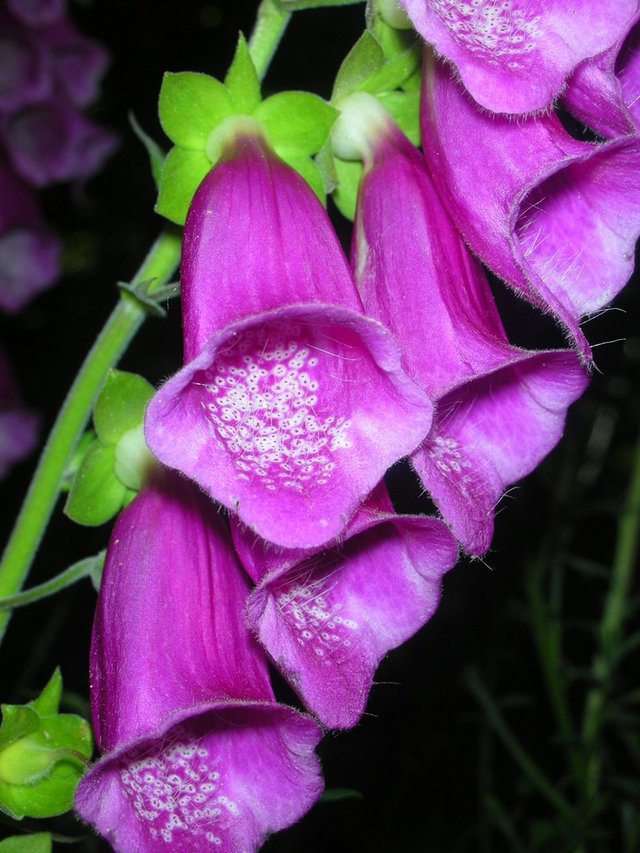 Les hampes florales sont imposantes et portent des fleurs en forme de cloches suffisamment grandes pour être pollinisées par des insectes de gros gabarit comme les bourdons. La digitale fait vraiment tout pour les attirer. Regardez bien les fleurs, vous y verrez des taches et des poils : les premières sont là pour baliser le chemin de l’insecte, les deuxièmes retiennent le pollen de ceux qui arrivent et qui en sont chargés. La nature est vraiment bien faite!