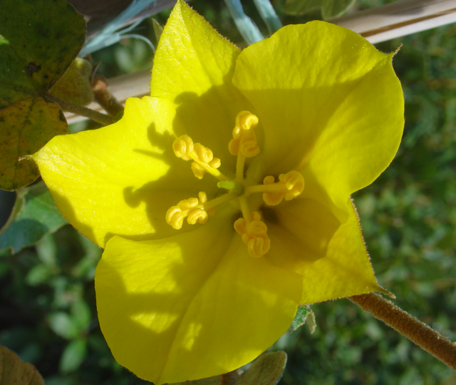 Le fremontodendron a des tiges à l’aspect duveteux, on a envie de toucher cet aspect de velours, mais gardez-vous bien de le faire. Ces poils sont très irritants et ne s’enlèvent que très difficilement quand ils sont incrustés dans la peau: contentez-vous d’admirer et si vous devez manipuler la plante, mettez des gants!
