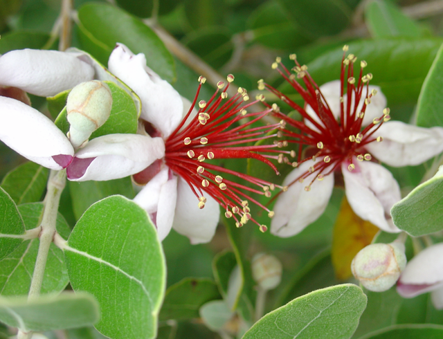 Le goyavier qui illustre cette note a été photographié au mois de juillet alors qu’il était en pleine floraison, et quelle floraison! Si vous ne connaissez pas cet arbuste, vous allez être séduit par la beauté de ses fleurs aux longues étamines rouges.
