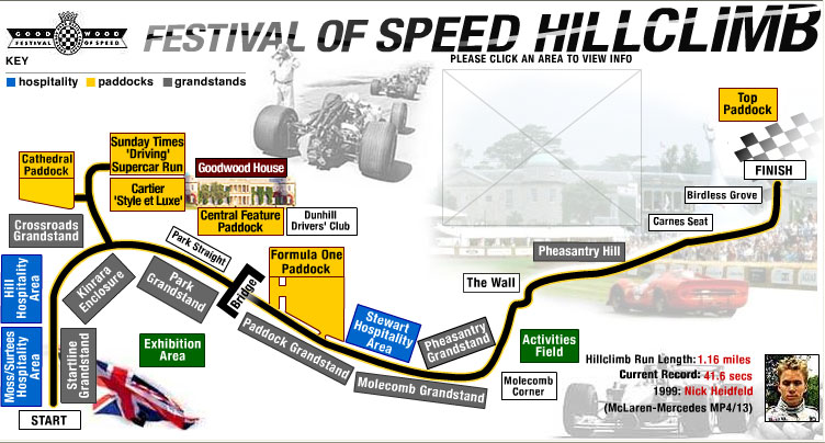 This festival is attended by very famous people too : Jean Alesi, Ralf Schumacher, Derek Bell, Juan-Pablo Montoya, Jack Brabham, Rubens Barrichello, Mario Andretti, Jenson Button, Richard Burns, David Coulthard, Emerson Fittipaldi, Jim Hall, Jacky Ickx, Damon Hill, Phil Hill, Juha Kankunnen, Timo Makinen, Niki Lauda, Nick Mason, Collin McRae, Olivier Panis, Ricardo Patrese, Clay Regazzoni, Sir Jacky Stewart or John Surtees will stalk the alleys of the exhibition. The complete list of celebrities can be consulted on the Goodwood Festival of Speed website.