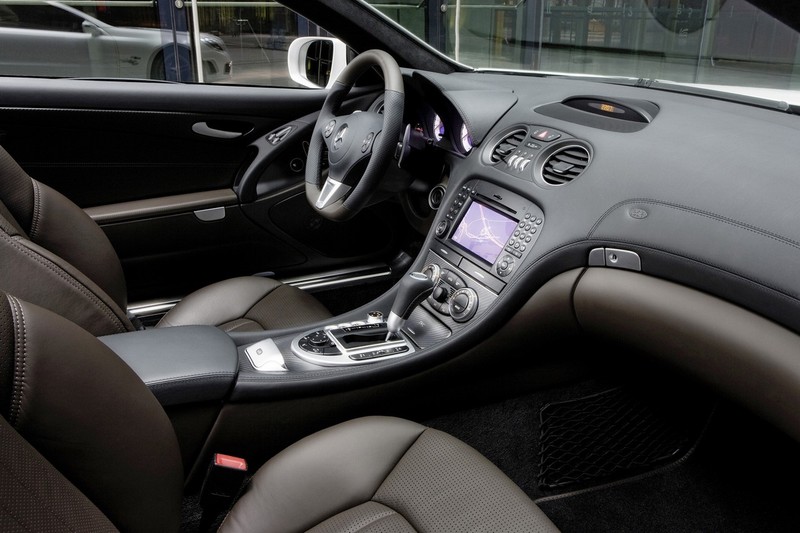 On the inside, the SL63 AMG IWC features a Tobago Brown nappa leather interior with carbon accents on both the door panels and central console. Other interior specific equipments include AMG sports seats featuring multicontour and memory functions, heating, an AMG-specific perforation pattern, a special design and AMG badges; black AMG floormats with Tobago Brown leather piping; AMG door sills with white illuminated AMG lettering; and the IWC logo on the lid of the central console.